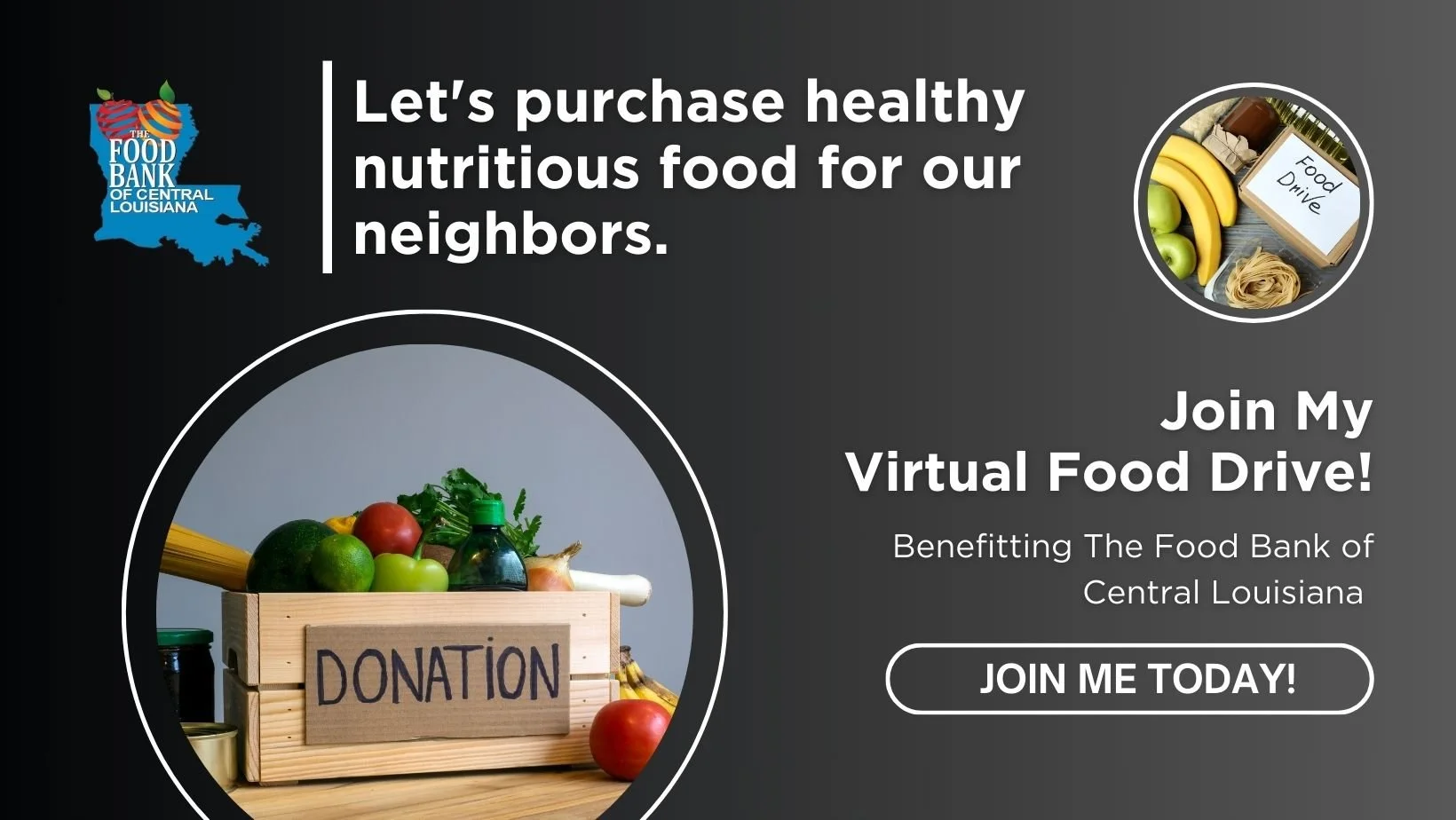 Join my virtual food drive to help raise money for the Food Bank of Central Louisiana! All donations will help the Food Bank purchase food for our neighbors facing hunger. Let’s fight food insecurity together! Click here to contribute: ((insert food drive fundraising page link)) Thank you for your support!
